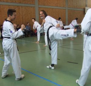 und dabei die moderne und bei den Olympischen Spielen zugelassene Form der koreanischen Kampfsportart Taekwondo.
