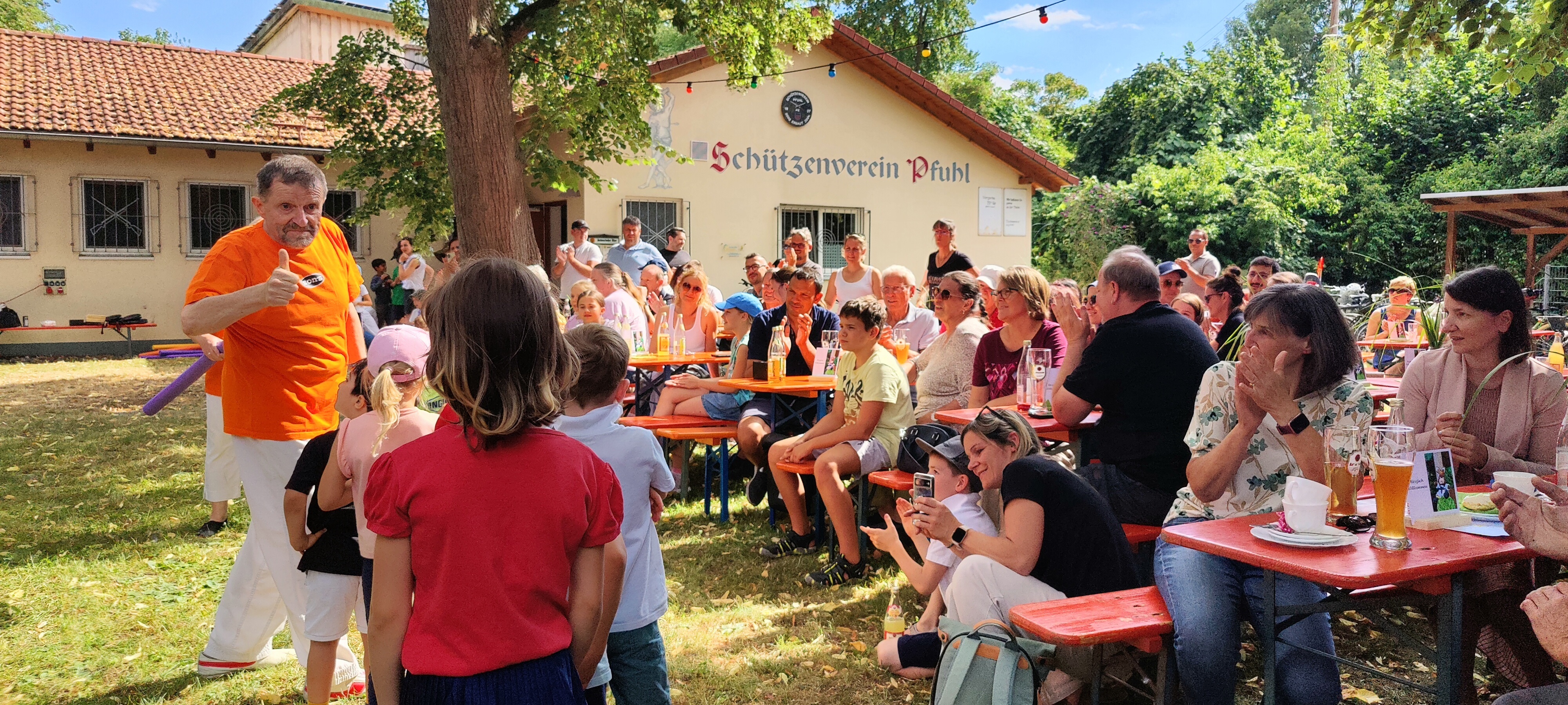 Unser diesjähriges Sommerfest stand ganz unter dem Motto „5 Jahre Tokki“. Tokki (koreanisch für Hase) ist unser Abteilungsmaskottchen, der bei jeder Prüfung und bei jedem Lehrgang dabei ist, motiviert, Daumen drückt und manchmal auch Geschenke verteilt. Zu seinem Geburtstag durften er und Abteilungsleiter Hans 160 Gäste begrüßen. Ein Highlight war DJ Martin, der das Vorführungsteam musikalisch perfekt unterstützt hat und groß und klein den ganzen Nachmittag und Abend bestens unterhalten hat. 30 unserer Sportler*innen haben ein gemischtes Programm zur Unterhaltung vorbereitet. Unsere Minis starteten voller Elan mit einem Mix von Trainingsinhalten wie Koordinationsübungen, Kicks und Selbstverteidigung. Darauf folgten Technikabläufe, Leiterübungen, Formen, Wettkämpfe und Bruchtests aller Gürtelgrade. Sogar Tokki zeigte mit der Taeguk Chill-Chang sein Können. Als Sahnehäubchen spielte sogar das Wetter perfekt mit. Danke an ALLE Helfer*innen, die für das Gelingen unseres Sommerfestes beigetragen haben, auch an das Team des Schützenheimes und an alle Familien, die wunderbare Beiträge für unser Kuchen- und Abendbuffet mitgebracht haben.